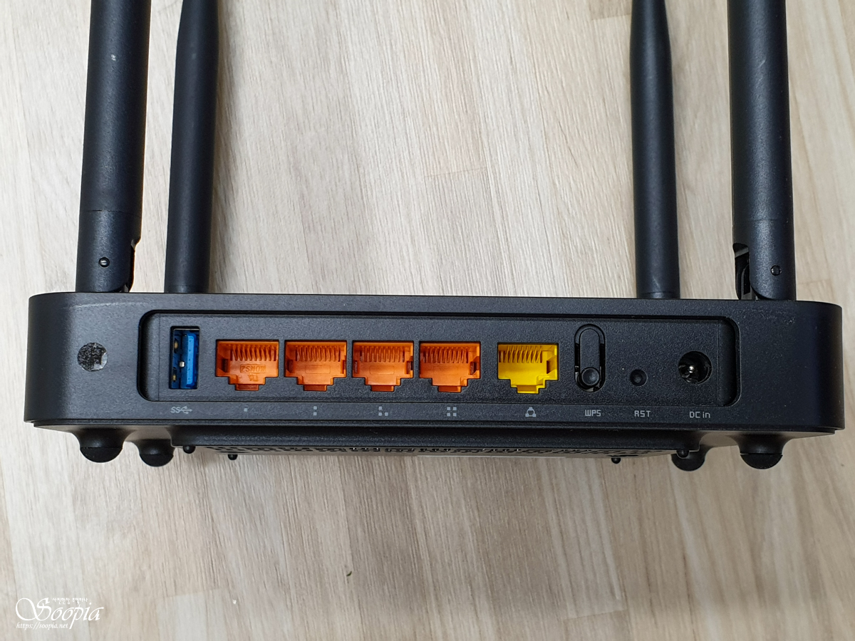 뒷쪽을 보면 USB3.0 포트와 랜포트, WPS버튼, 리셋버튼 그리고 전원단자가 자리잡고 있다.